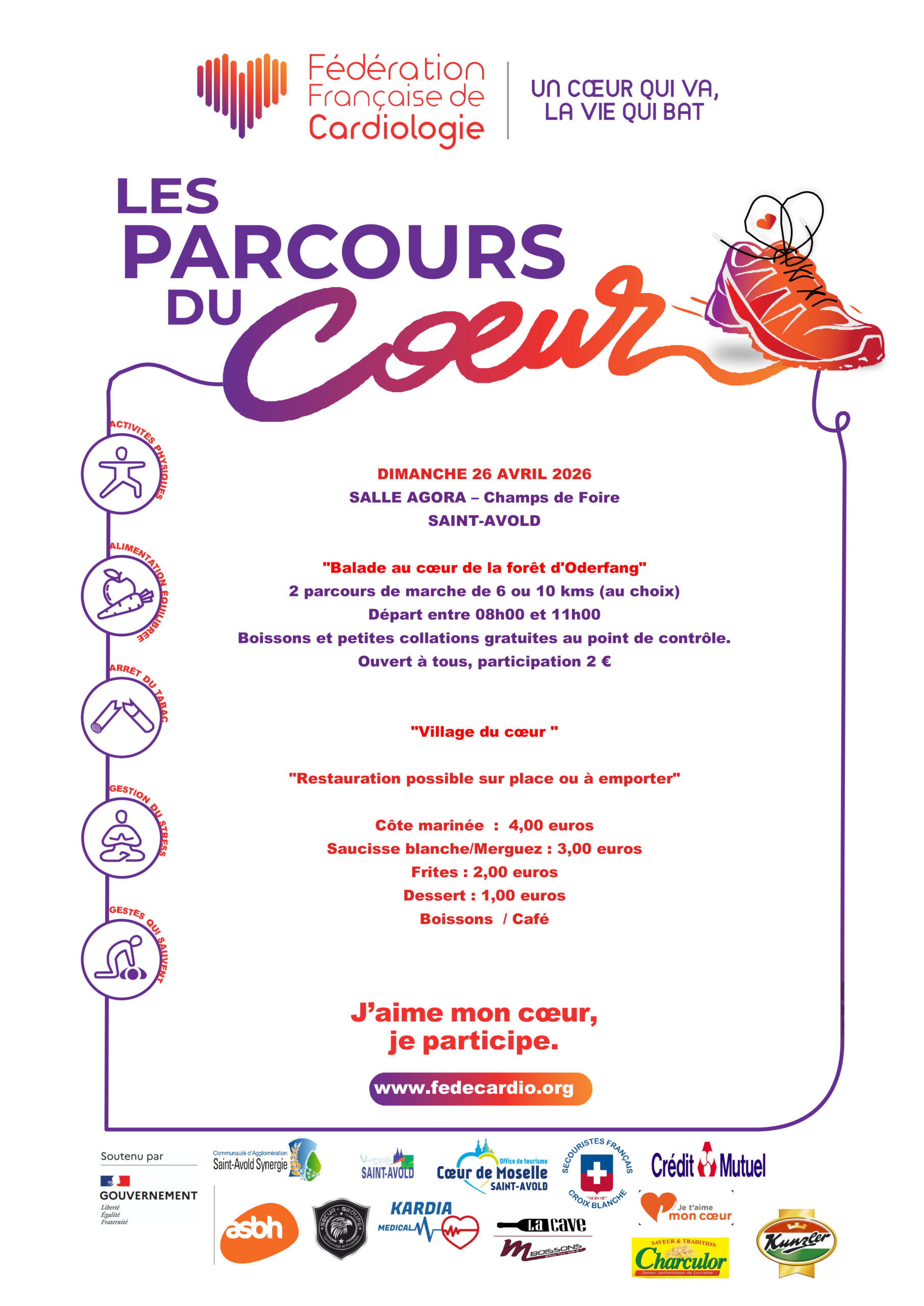 Parcours du Coeur 2026 Le 26 Avril 2026, venez nombreux participer aux parcours du Coeur. Départ de la salle AGORA à partir de 08h00. Dernier départ : 11h00 Inscription : 2,00 € - Ravitaillement à mi parcours. Restauration rapide sur place Publié le : 02/04/2026